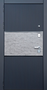 Входная дверь с комбинированной отделкой из синих панелей МДФ + вставка ПВХ КД-1442